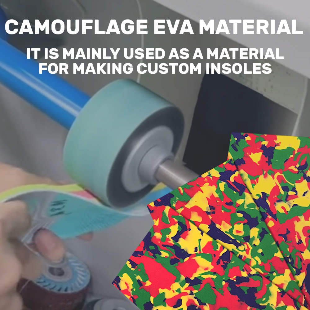 This high-quality camouflage EVA sheet offers excellent elasticity, shock absorption, and durability. Perfect for custom orthopedic insoles, shoe midsoles, sports equipment, and various footwear applications. Available in multiple thicknesses and densities for flexible customization.